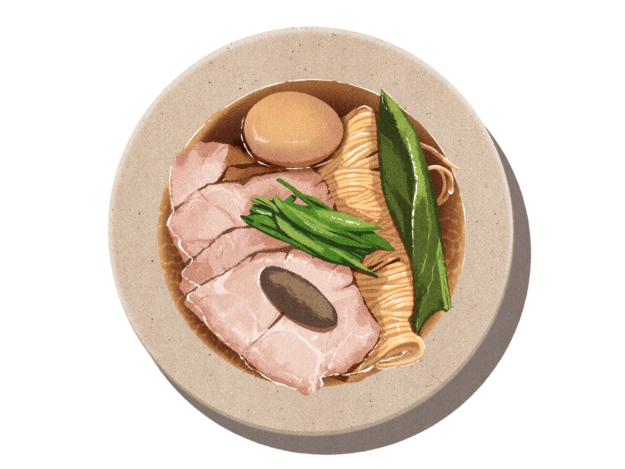 Chicken + smoked mackerel and seafood broth with chashu, tamago, spring onions, daikon, red pepper corns, rucola and basil, lemon thyme.